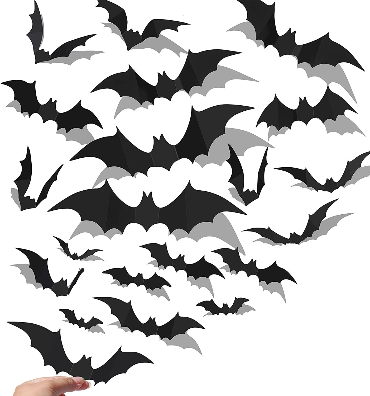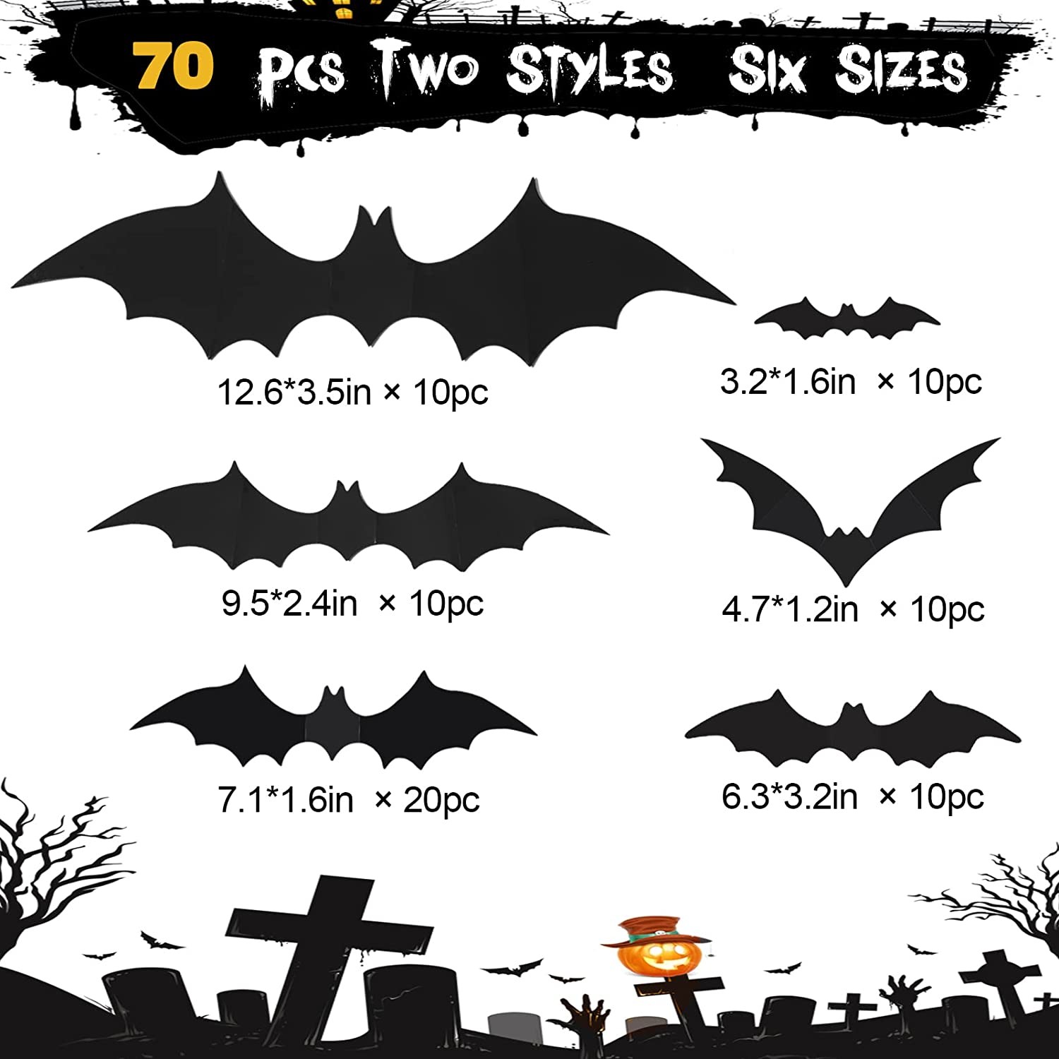 ?[Realistic 3D Bat Sticker] All BINDUO bats have added indentation lines on the wings to help the bats bend better. You can fix and fold the bats at different angles according to their indentation lines so that you can get the perfect bats.On the night before Halloween you can stick it where you want to stick it, in the dim light, you can not see that it is a fake bat. ?[Great Value Set in Many Sizes] The BINDUO Halloween Decoration Kit contains 70 bats in 6 different sizes (10 Extra Large 12.6"*3.5" Bats, 10 Large 9.4"*2.4" Bats, 20 Medium 7.1 inch*1.6" bats, 10 medium 6.3"*3.1" bats, 10 small 4.7"*1.2" bats, 10 mini 3.1"*1.6" bats) and 96 extra double-sided stickers, Meet your various decorative needs. ?[Reusable] BINDUO bats are made of high-quality PVC, waterproof, removable, very strong, thick, durable, and repositionable wall art stickers, you just need to peel off the old glue on the back of the bat and stick the new glue on the back of the bat to reuse. ?[Warm Tips] Do not stick to the vent, otherwise it will fall off easily, remember to clean the dust on the surface before use. To avoid stickers peeling off, do not stick the double-sided tape on the matte side.Heat it with a hair dryer and take it off easily without any trace.If you accidentally paste it in the wrong place, you can tear it off and paste it again. ?[100% Satisfied] If for any reason you are not satisfied with any of our products, please contact us as soon as possible. We take full ownership and responsibility for the quality of our products, and we will give you a satisfactory answer!