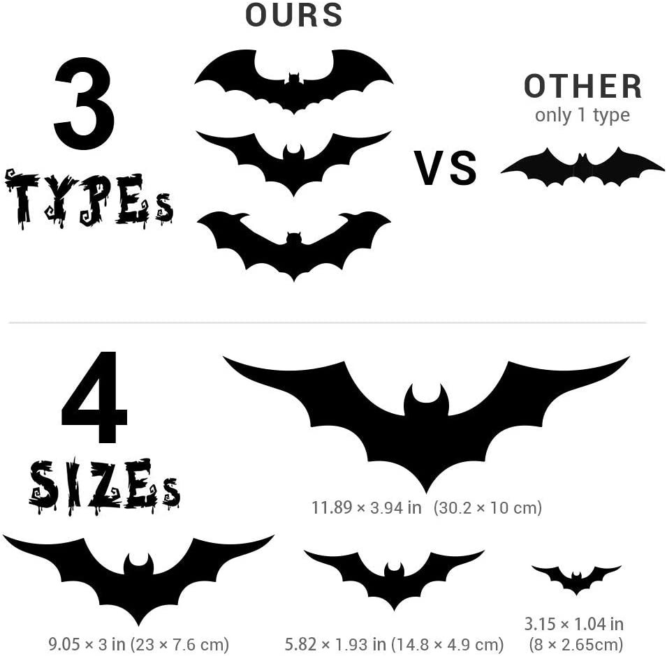 NEWEST & BEST VALUE HALLOWEEN WALL DECOR - Comes with 60pcs Halloween bats wall decor,which is in 3 styles and 4 sizes of each style.Create your own "bat cave" with this 60-piece kit! Scary bat decor all over the wall or window. Arrange them as you wish. You definitely want them in your Halloween Party. VARIOUS STYLES,SIZES & PREMIUM QUALITY - Compared to others,we offer 3 styles of bats stickers and 4 sizes of each style,which makes your walls/doors/glass and other hard surfaces more attractive,creating a more horrible and realistic Halloween scenes.Besides,they are made of PVC material,durable and reusable, you can tear them off when the party is over and store them carefully. WONDERFUL PARTY DECORATIONS CHOICE - 3D decorative bats are great for Halloween parties,school carnivals,Batman-theme parties and easy haunted house decorations.The vivid color and shape are especially fit Halloween scene, adding your room a Halloween mood.One set meets all of you need. EASY TO APPLY - DIY them into different wing angles. Easy to stick. Just stick the item with double-sided adhesive. Fit any smooth and dry surface like painted wallglass ile (REMEMBER to CLEAN the dust before applying). Press firmly onto the surfaces. 100% RISK FREE PURCHASE - We provide 12 months warranty for you to ensure your zero-risk investment.Please feel free to contact us if there is any problem,and we will refund fully if you are not satisfied.