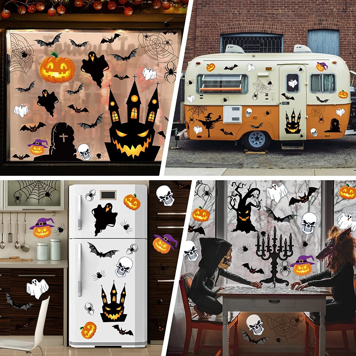 ?PERFECT ADDITION TO HALLOWEEN: Halloween window clings with various spooky elements are perfect for Halloween party favors, haunted house decorations and trick-or-treat night. Suitable for Halloween window decoration, Halloween indoor outdoor decor, home decor, door decor, office, retail store, restaurant decor and etc. Add more horrific effects, creep out all trick-or-treaters this Halloween!