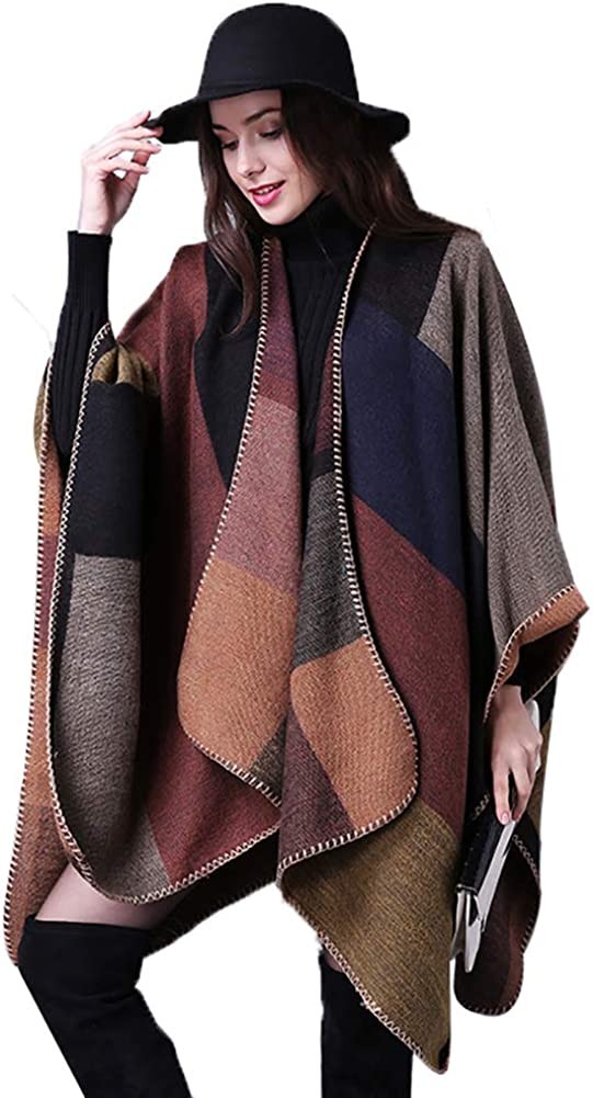 Epsion Women's Color Block Shawl Wrap Plus Size Cardigan Poncho Cape Open Front Long Winter Sweater Coat