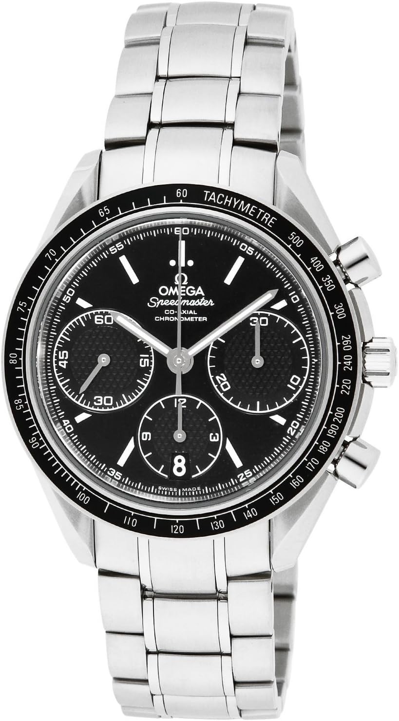 Black dial. Silver-tone stainless steel case with a silver-tone stainless steel band. Automatic movement. 100 meters / 330 feet water resistance. Fixed Tachymeter Scale bezel. Deployment with Push Button Release clasp. Case size 40 mm x 15 mm. Omega 326.30.40.50.01.001 Speedmaster Racing Watch.