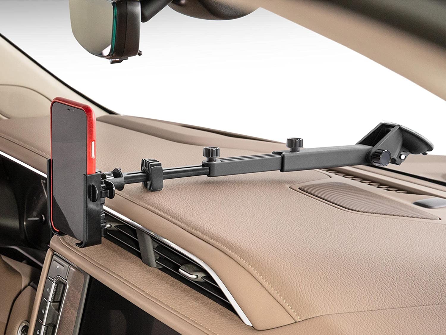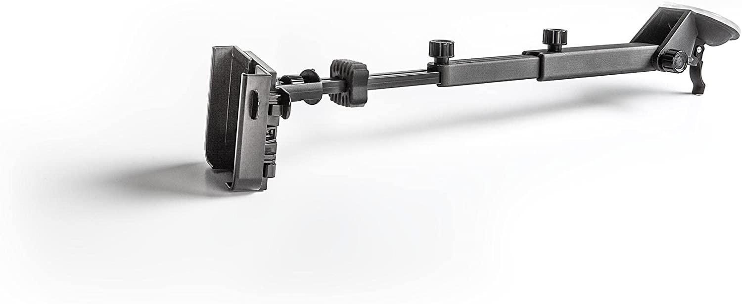 Includes three arm options to fit different depths of dashboards: A 3” arm for short dashes, or to mount so it hovers above it. A 5” arm for medium-sized dashboards. A telescopic arm that adjusts from 7¾” up to 15 5/16” to fit the deepest of dashes Quick Lock & Release allows you to insert and remove your phone in seconds, with one hand: when you hear the click, you’re ready to roll! Phone holder pivots, tilts and rotates for ideal viewing of your mobile device. Stabilizing rubber bumper helps prevent excessive movement Rest it on your dashboard, or mount it to hover above the dash as low as possible Holder is over 1/2" deep and expands from 2.5" to 3 11/16" wide, accommodating most mobile phones